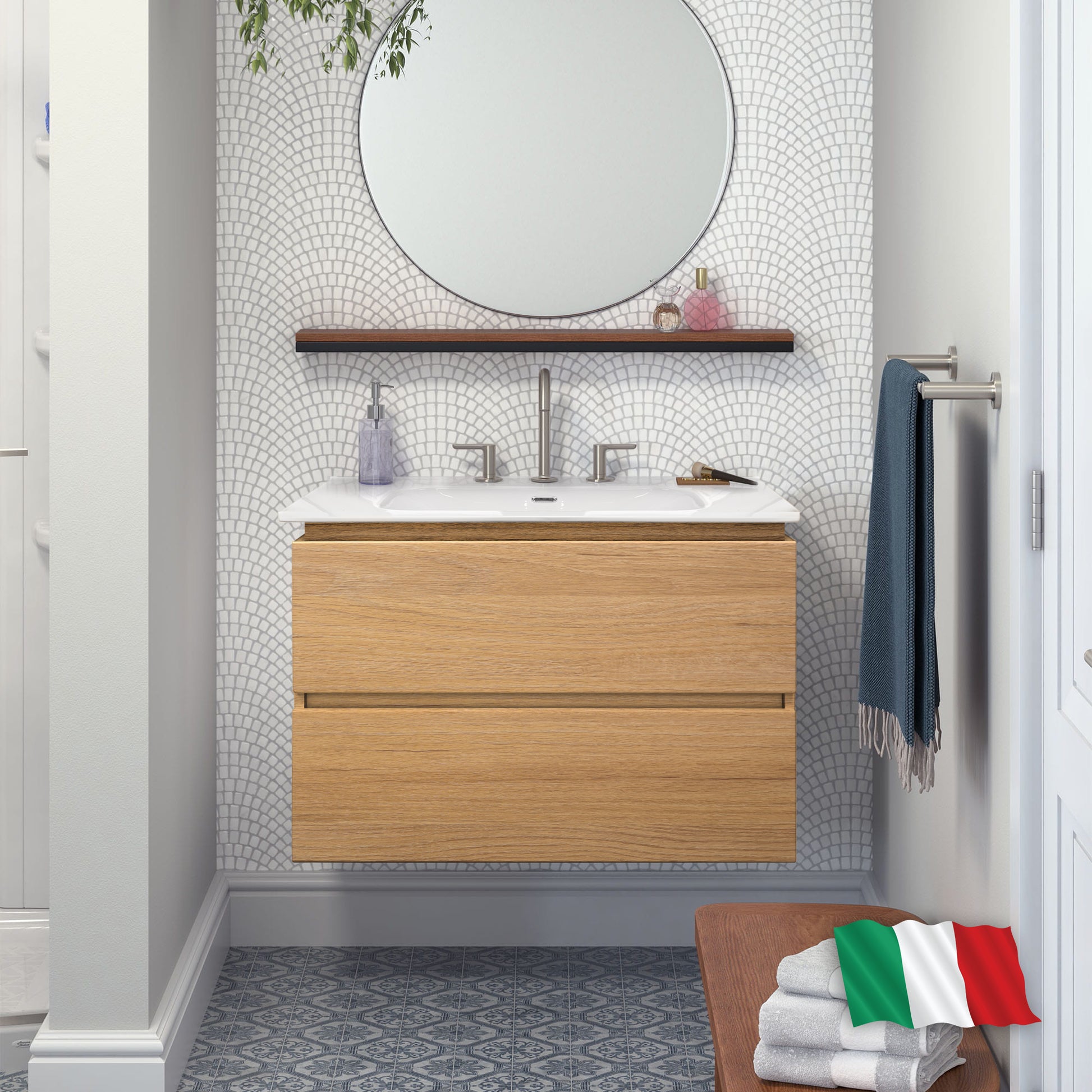 An ultra functional minimalist storage solution for any modern bathroom, the Avril vanity features a chic tobacco oak finish, and two large soft-closing drawers for ultimate convenience. Comes with a matching ceramic sink ready for a single hole faucet.
