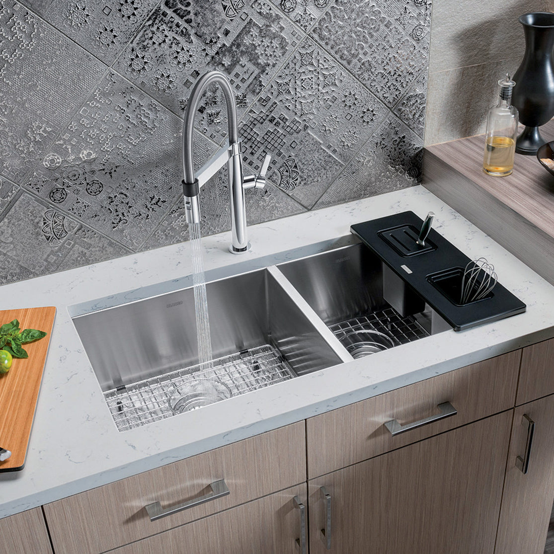 The Quatrus R0 Double Bowl Undermount Kitchen Sink is crafted with crisp, zero radius corners, and 18-gauge steel. Manufactured with a lustrous satin finish, the Quatrus is the ideal choice for premium kitchens. This hardworking, durable and versatile sink offers more than just good looks.