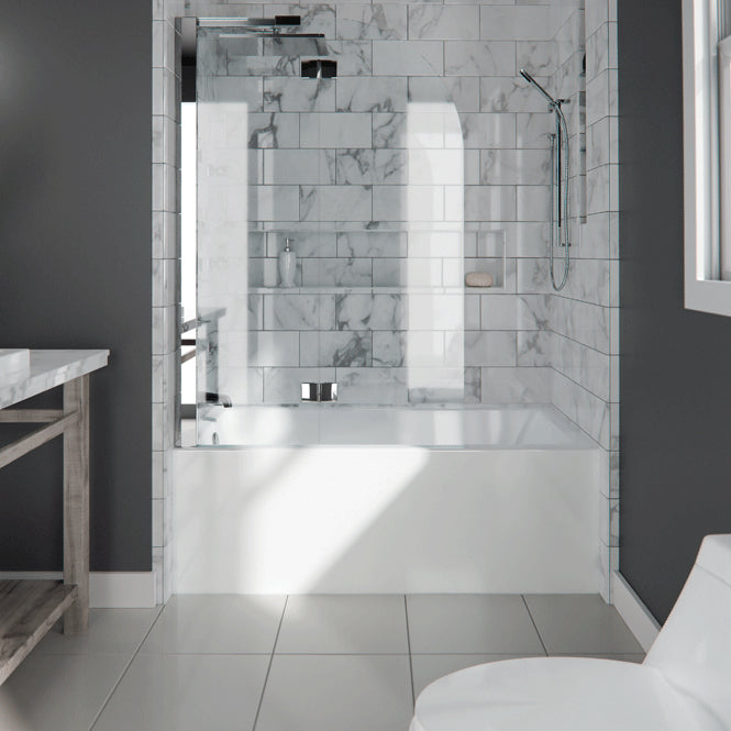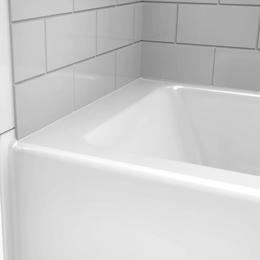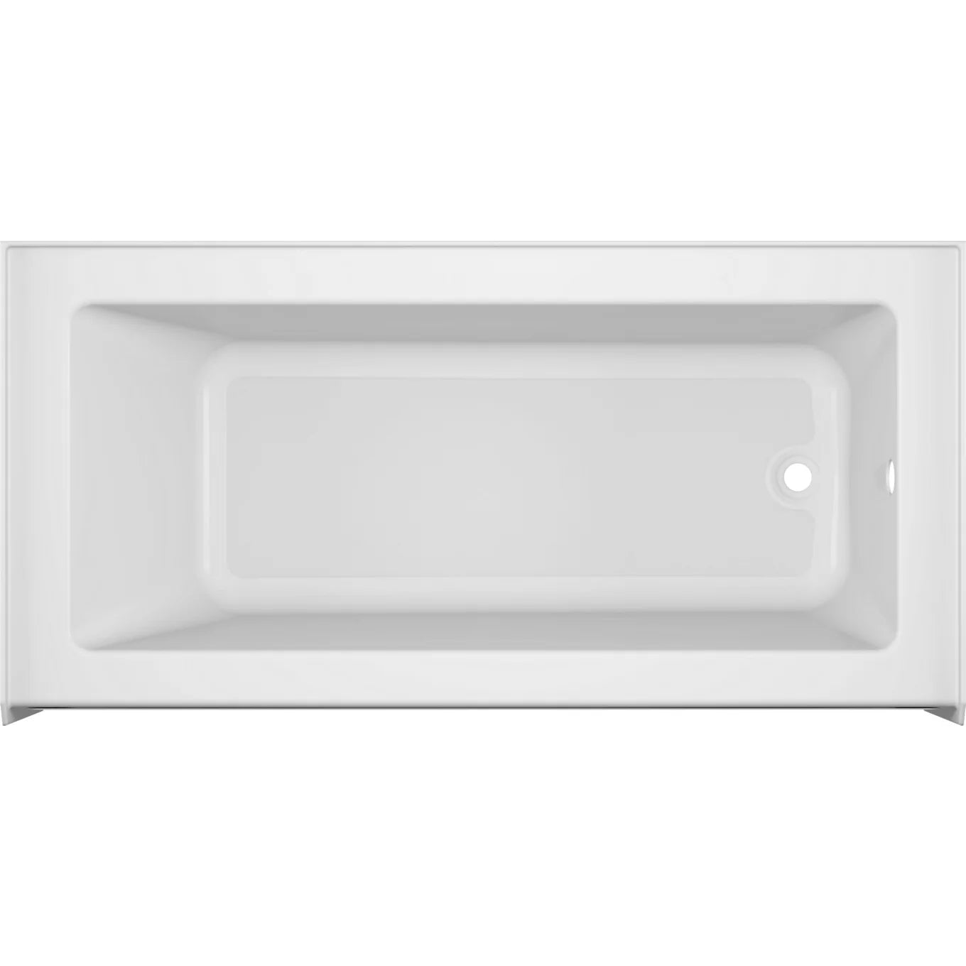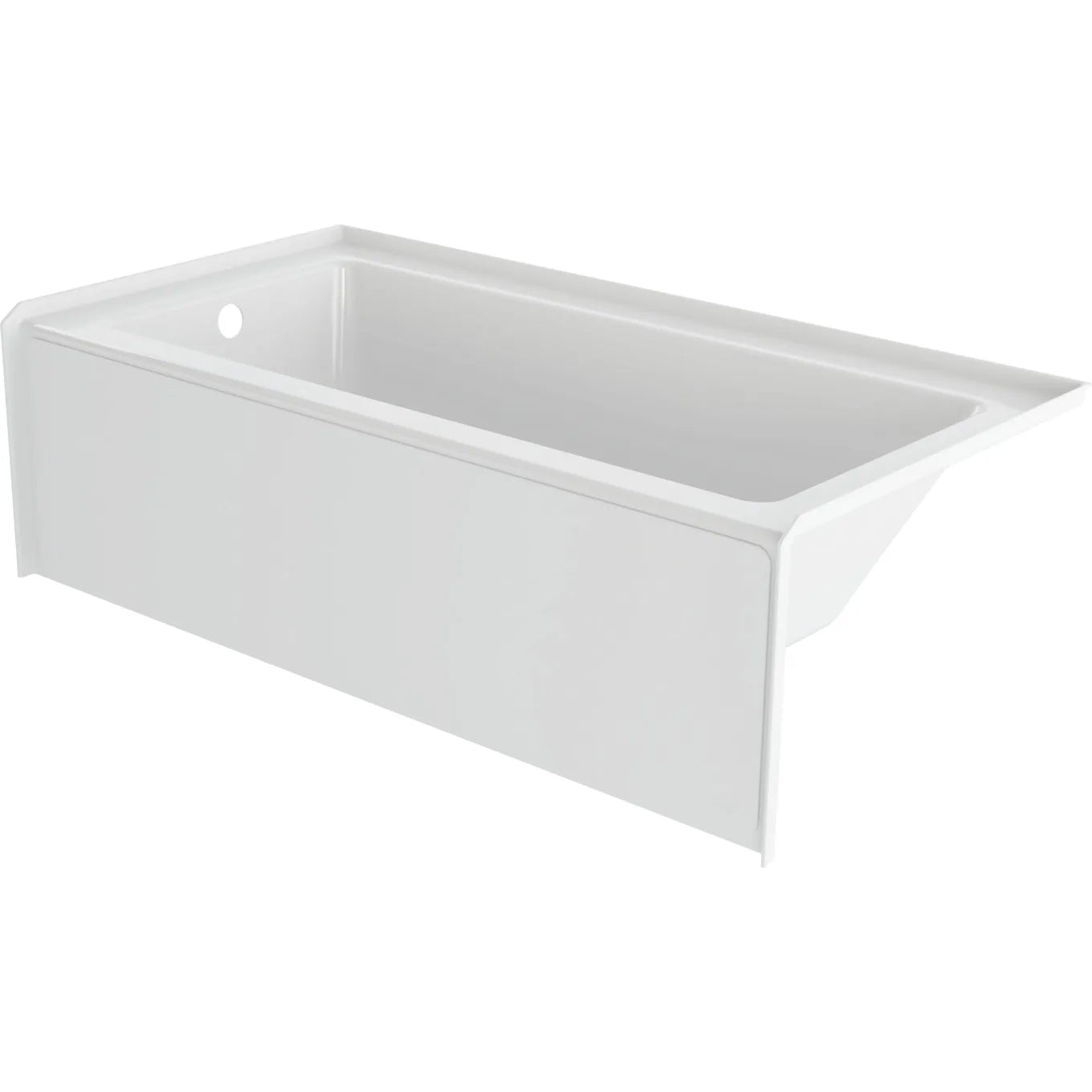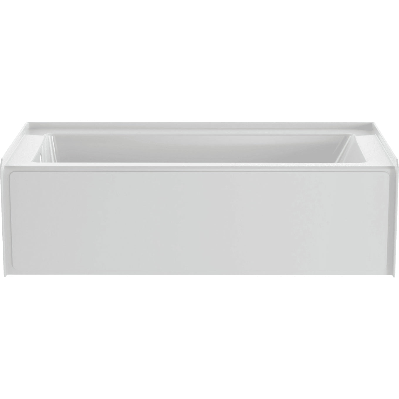 60 inch, 47 gallon white acrylic skirted alcove bathtub with left or right drain. Thermoformed and reinforced with fiberglass, with adjustable legs and tiling flange.